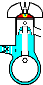 At an exact point just before the piston reaches the top of the cylinder the spark plug fires. The spark ignites the mixture which rapidly expands propelling the piston downwards. Once the top edge of the piston uncovers the exhaust port the exhaust gasses start to vent out through the exhaust. Meanwhile the fuel/air mixture in the crankcases below the piston is being compressed as the piston descends and the reed valve closes. Once the top of the piston uncovers the transfer ports the compressed fuel/air in the crankcase passes up through the ports to start charging the cylinder with fresh mixture which also serves to expel the remaining exhaust gasses. The fuel/air mixture from the crankcase continues to pass through the transfer ports until the piston reaches the bottom.